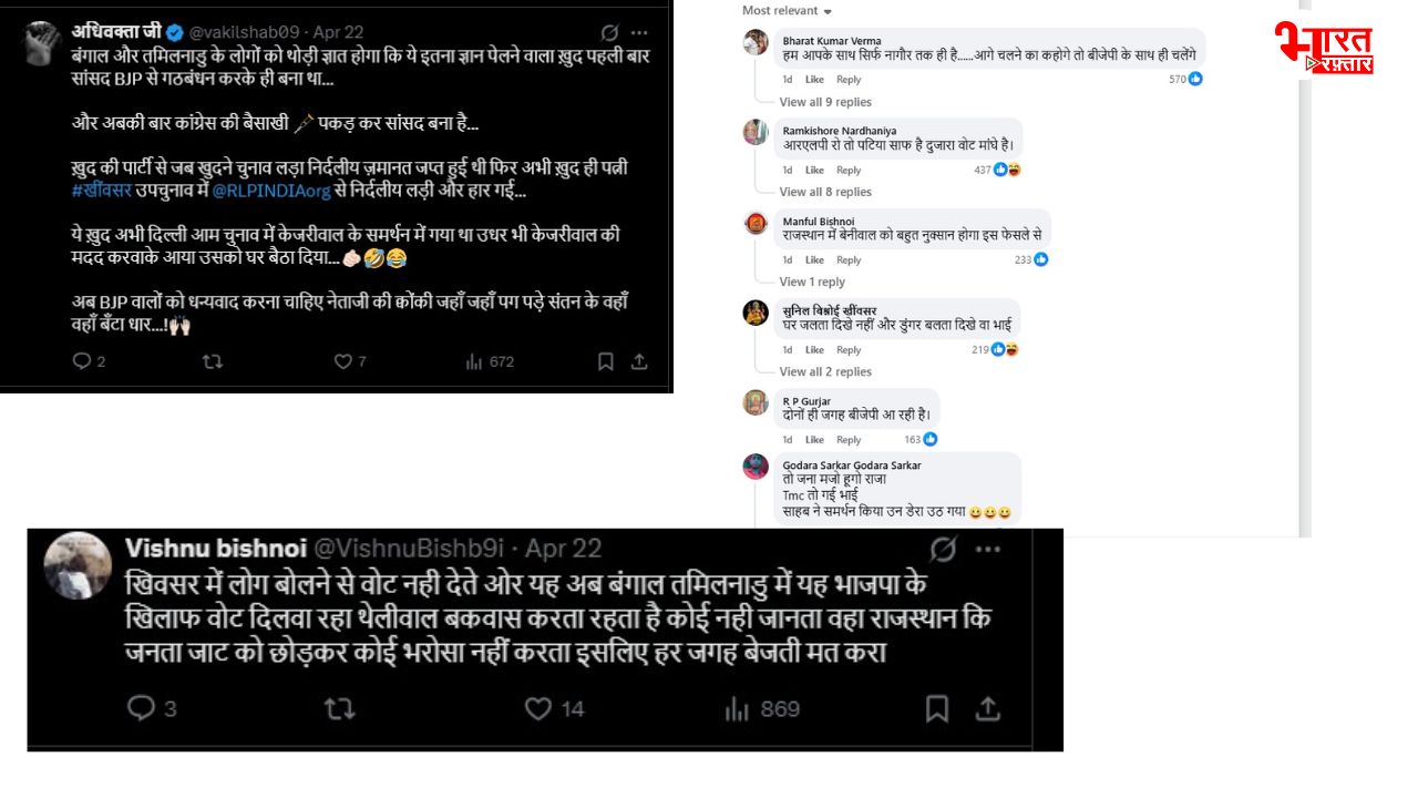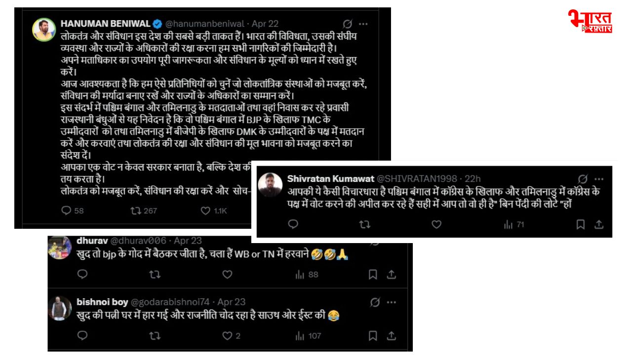 क्योंकि उनकी इस अपील पर सोशल मीडिया पर उनके समर्थक अजीब ही कमेंट कर रहे हैं। एक समर्थक लिखते हैं-"हम आपके साथ सिर्फ नागौर तक ही हैं... आगे चलने का कहोगे तो बीजेपी के साथ ही चलेंगे।" वहीं, एक और यूजर विष्णु बिश्नोई ने तो सीधे तौर पर बेनीवाल को नसीहत दे डाली। उन्होंने लिखा-"खींवसर में लोग बोलने से वोट नहीं देते...यानी अब ये सवाल लोग पूछ रहे हैं जो नेता राजस्थान में अपनी पार्टी को पूरी तरह खड़ा नहीं कर पाया, वो बंगाल और तमिलनाडु में वोट कटवा राजनीति क्यों कर रहा है?