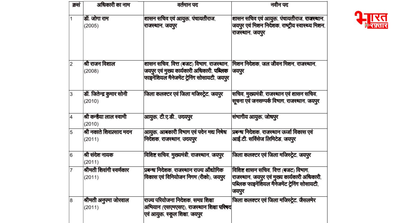 लिस्ट के मुताबिक वरिष्ठ अधिकारी डॉ. जोगाराम को पंचायतीराज के साथ राष्ट्रीय स्वास्थ्य मिशन का प्रभार सौंपा गया है। राजन विशाल को जल जीवन मिशन की जिम्मेदारी दी गई है, जबकि अरविंद कुमार पोसवाल अब राजस्थान आवासन मंडल के आयुक्त होंगे। डीग कलेक्टर रहे उत्सव कौशल को मुख्यमंत्री के संयुक्त सचिव का पद दिया गया है।