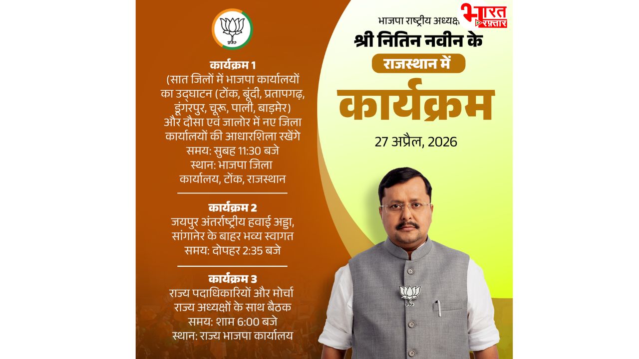 बीजेपी के राष्ट्रीय अध्यक्ष नितिन नबीन राजस्थान के टोंक से जनता की नब्ज टटोलेंगे। टोंक से तो वे 7 जिलों में बीजेपी कार्यालयों का उद्घाटन करेंगे। टोंक, बूंदी, प्रतापगढ़, डूंगरपुर, चूरू, पाली, बाड़मेर में नए कार्यालय खुल रहे हैं। वहीं दौसा और जालोर में नए जिला कार्यालयों की आधारशिला रखी जाएगी। इसके बाद वे दोपहर में ढाई बजे जयपुर एयरपोर्ट आएंगे जहां पर उनका भव्य स्वागत किया जाएगा। वहीं शाम को 6 बजे वे जयपुर के ही जयपुर कार्यालय आएंगे जहां पर राज्य पदाधिकारियों और मोर्चा राज्य अध्यक्षों के साथ बैठक होगी।