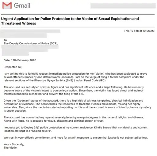 ई-मेल में युवती ने लिखा है कि आरोपी को पहले ही पता चल गया था कि वह एफआईआर दर्ज कराने वाली है। इसलिए उसे पहले ही प्रत्यक्ष और अप्रत्यक्ष रूप से धमकियां मिलनी शुरू हो गई हैं। उत्तम स्वामी और उनके सहयोगी पीड़िता पर समझौता करने का दबाव बना रहे हैं। पीड़िता का कहना है कि आरोपी के पास उसके और परिवार की निजी जानकारी है, जिसकी वजह से वह सबूतों से छेड़छाड़, गवाहों को प्रभावित करने या पीड़िता और उसके परिवार को नुकसान पहुंचाने की कोशिश कर सकता है।