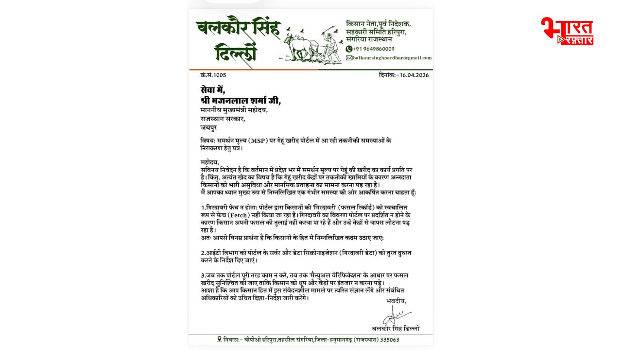 Hanumangarh: हनुमानगढ़ में MSP पर चल रही गेहूं खरीद पोर्टल में काफी समस्या आ रही है जिसकी वजह से किसान को बड़ी समस्या का सामना करना पड़ रहा है। इसे लेकर किसान नेता बलकौर सिंह ढिल्लों ने प्रदेश के मुख्यमंत्री भजनलाल शर्मा को लेटर लिखा है। साथ ही संगरिया के उपखंड अधिकारी जय कौशिक, तहसीलदार मोनिका बंसल और हनुमानगढ़ के जिला कलेक्टर खुशाल यादव को भी लेटर लिखकर जल्द इस समस्या की मांग की है।